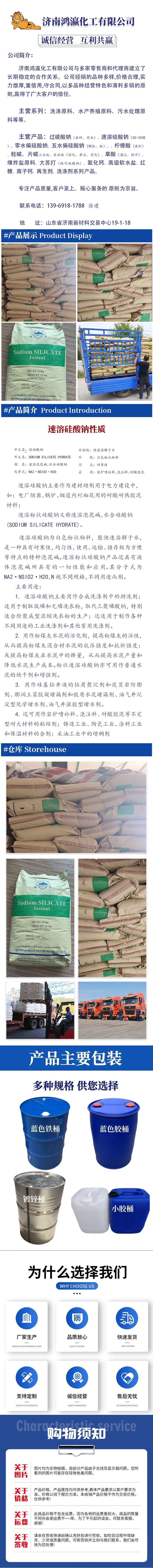 主营涵盖洗涤原料、水产养殖原料、污水处理原料三大核心板块,产品包括:过碳酸钠、速溶硅酸钠、零水偏硅酸钠、五水偏硅酸钠(颗粒 / 粉)、英轩柠檬酸、粒碱、工业级 / 食品级片碱、草酸、爆炸盐原料、大苏打(硫代硫酸钠)、氧化钙、高级软水盐、红糖、离子钙、再生剂及洗涤剂系列产品。